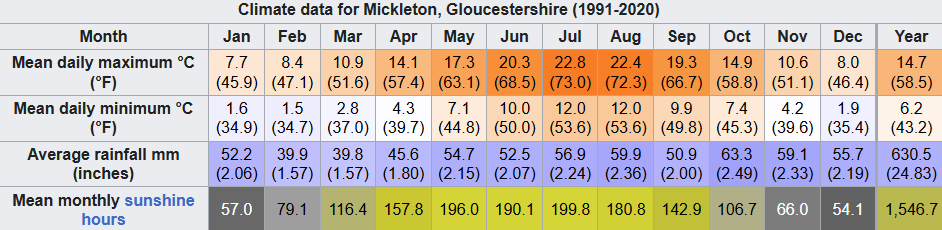 Mickleton and most of the UK's climate falls into the subtype 'Cfb', meaning our climate is temperate with few extremes (C), little seasonal variation in rainfall (f), and summers that are warm but not too hot (b).